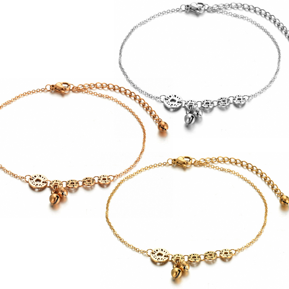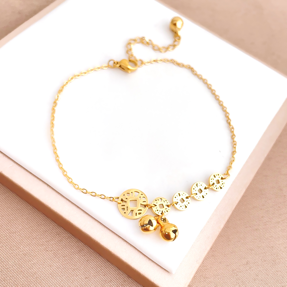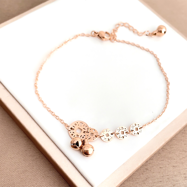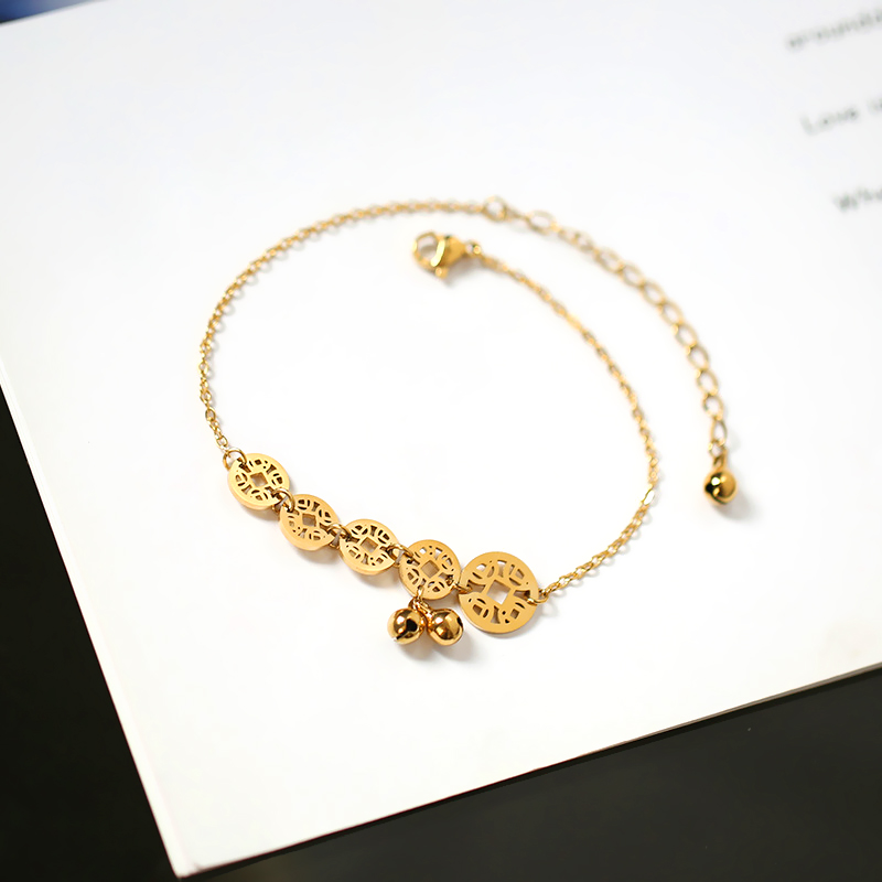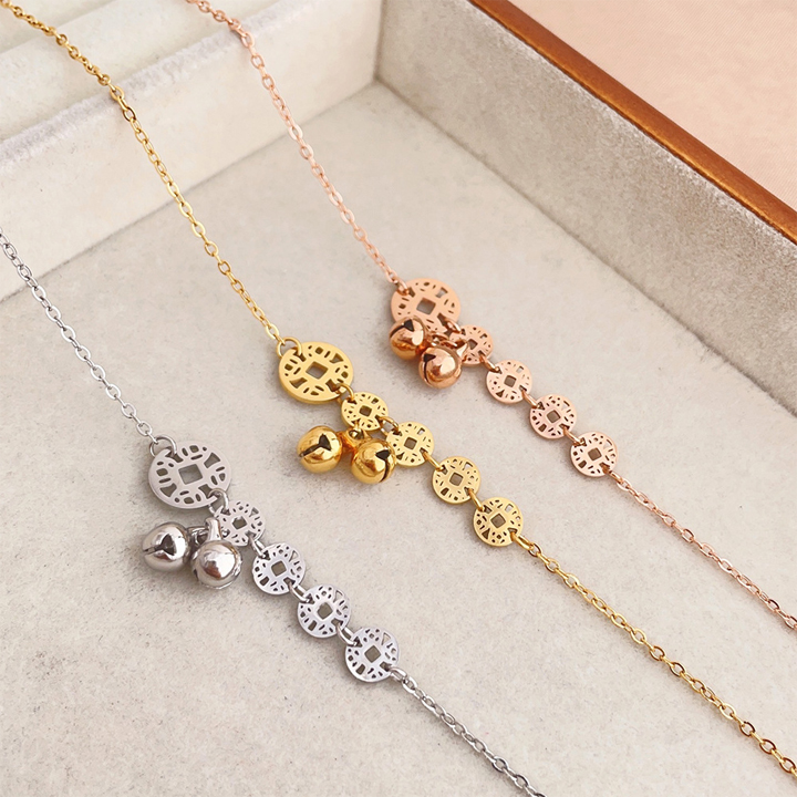 Lắc chân titan kim tiền có gắn chuông cực sang trọng được bán tại trang sức titan công sang – Xưởng sản xuất chuyên sỉ và lẻ trang sức titan nam nữ tại HCM.